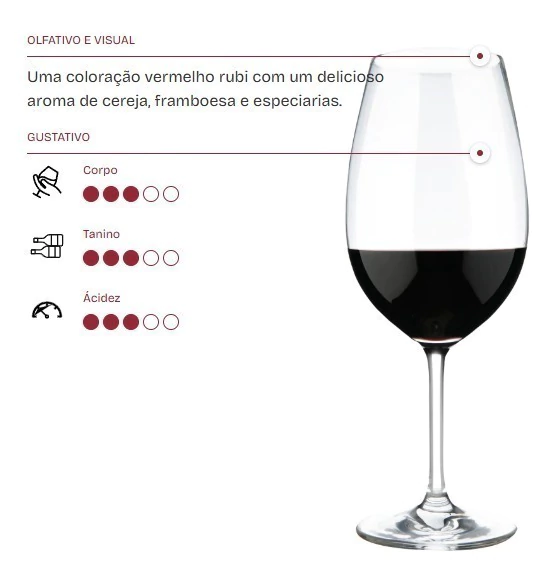 Vinho de cor rubi média, com aromas de frutas vermelhas como cereja e framboesa, além de especiarias. Em boca, é macio, de leve a médio corpo, com acidez refrescante. Ideal para massas com molho vermelho, aves assadas, embutidos e queijos semi-duros.